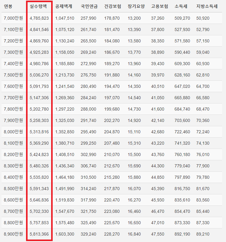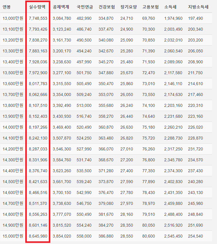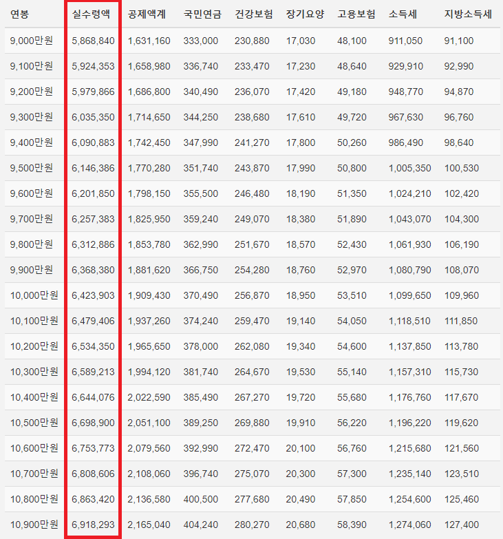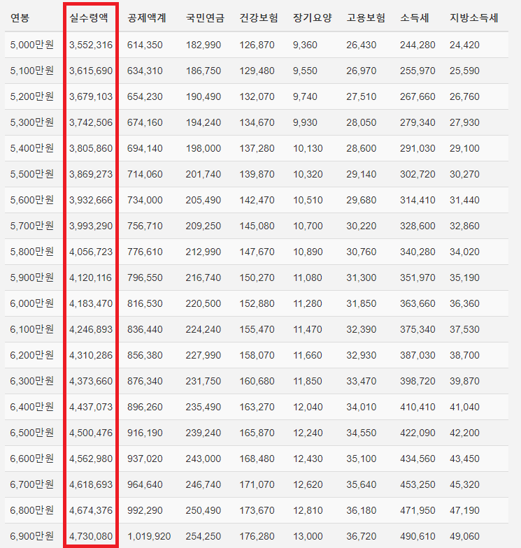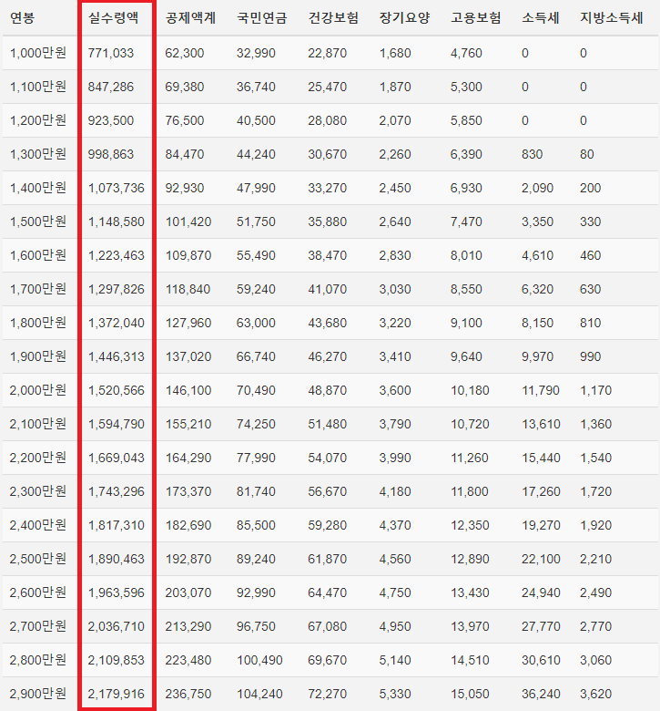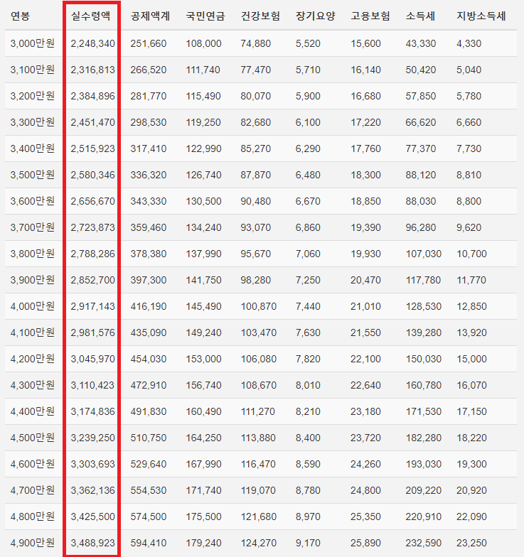 각 연봉별로 받는 실수령액은 얼마인 지 파악해봅시다.